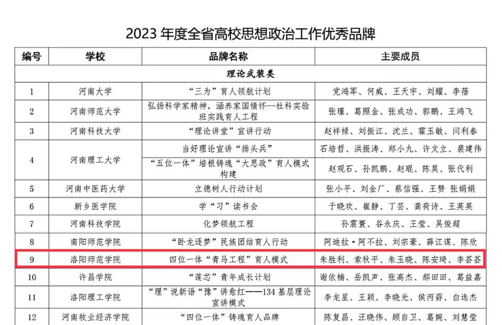 近日,2023年度全省高校思想政治工作奖评选结果公示,我校马克思主义学院“四位一体”青马工程育人模式思想政治工作成果荣获2023年度全省高校思想政治工作优秀品牌。