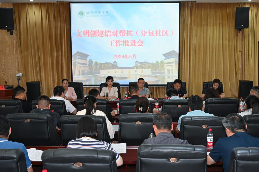 5月13日,学校在成均楼C301成均学堂召开文明创建结对帮扶(分包社区)工作推进会。伊滨区创建办主任程学录、副主任赵丽娟,光武街道办、诸葛镇和9个社区负责同志,我校党委组织部、党委宣传部和8个二级党组织相关负责人参加会议。会议由党委宣传部部长杨会宾主持。