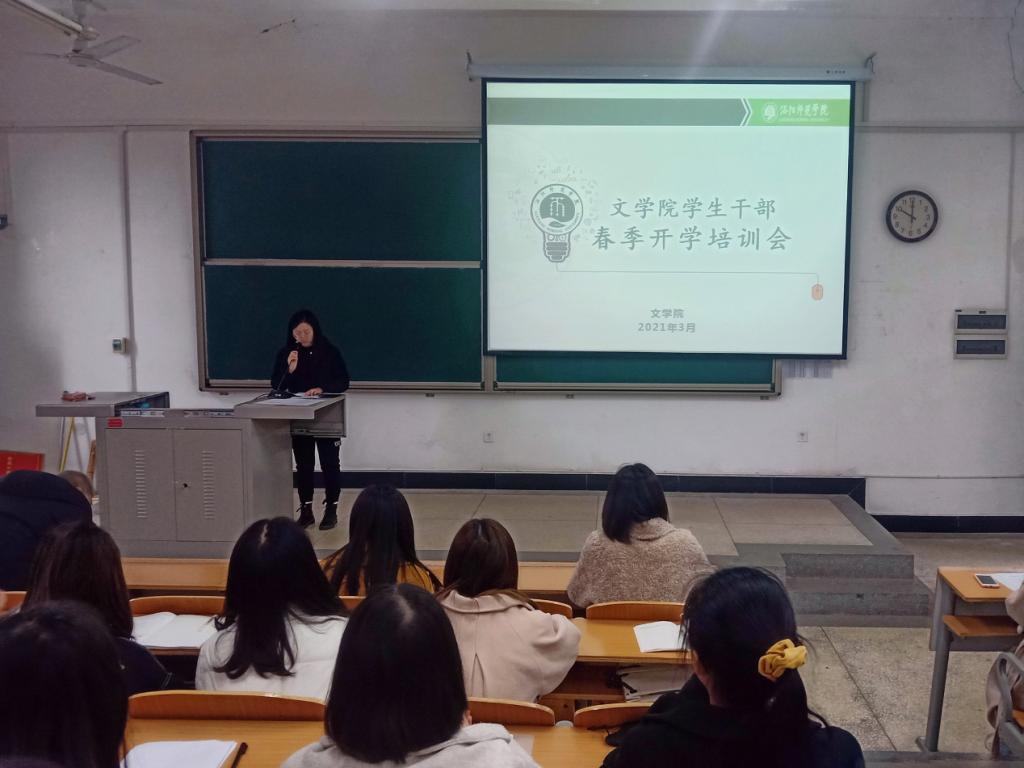 为了进一步提高文学院学生干部的综合素质,增强自我教育、自我管理、自我服务的意识,切实提高学生干部的综合能力,3月6日,文学院于A8-101召开学生干部春季开学培训会,此次培训会由文学院党委副书记张方方主讲,团委副书记段姣姣主持,文学院辅导员张曼、武悠、肖娜和文学院全体学生干部参加。