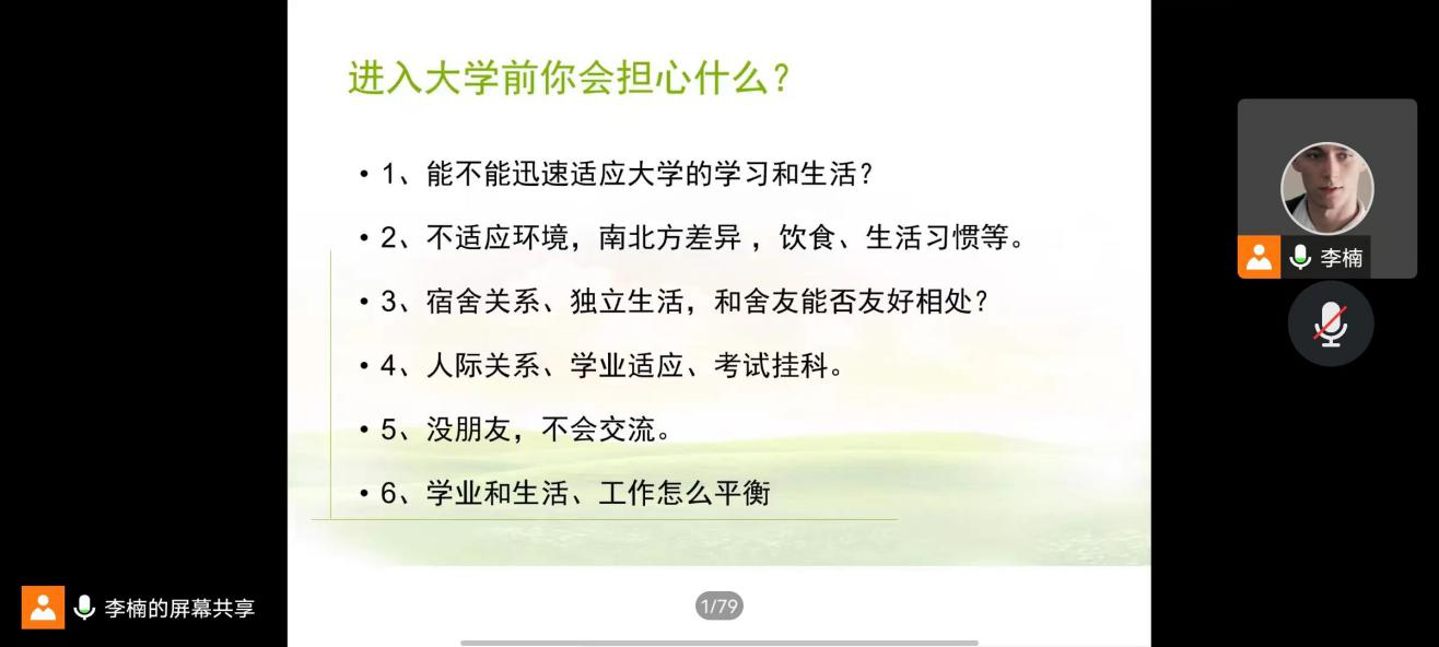 9月20日晚,李楠以“如何快速适应大学生活”为主题进行讲授,他结合自己大学生活的经验以及相关心理学知识提出了一些正确规避大学生活困扰的方法建议,为新生们快速适应大学生活提供了指南。