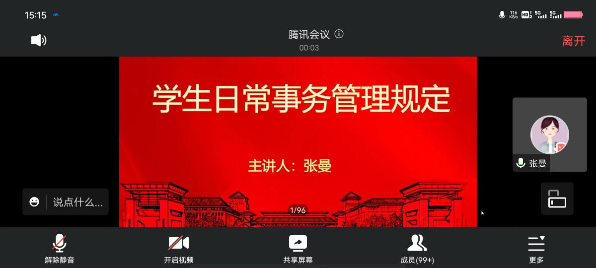 9月19日下午,张曼结合大学生《学生学习指导手册》向新生们详细讲述了学生日常事务管理工作,她着重强调了住宿管理规定、违章用电以及当前学校出台的疫情防控规定。孙晓锋解读了学籍管理和学位管理方法,并告诫新生树立起人生目标,实现自身人生价值。张方方以“抓稳安全,扬帆远航”为主题,强调了各方面的安全问题。他强调学生强化安全底线思维和红线意识,严格遵守相关要求,坚决消除校园内安全隐患,同时要以高度的责任感和使命感,扎实做好各项工作,为学校的健康发展营造良好的环境。