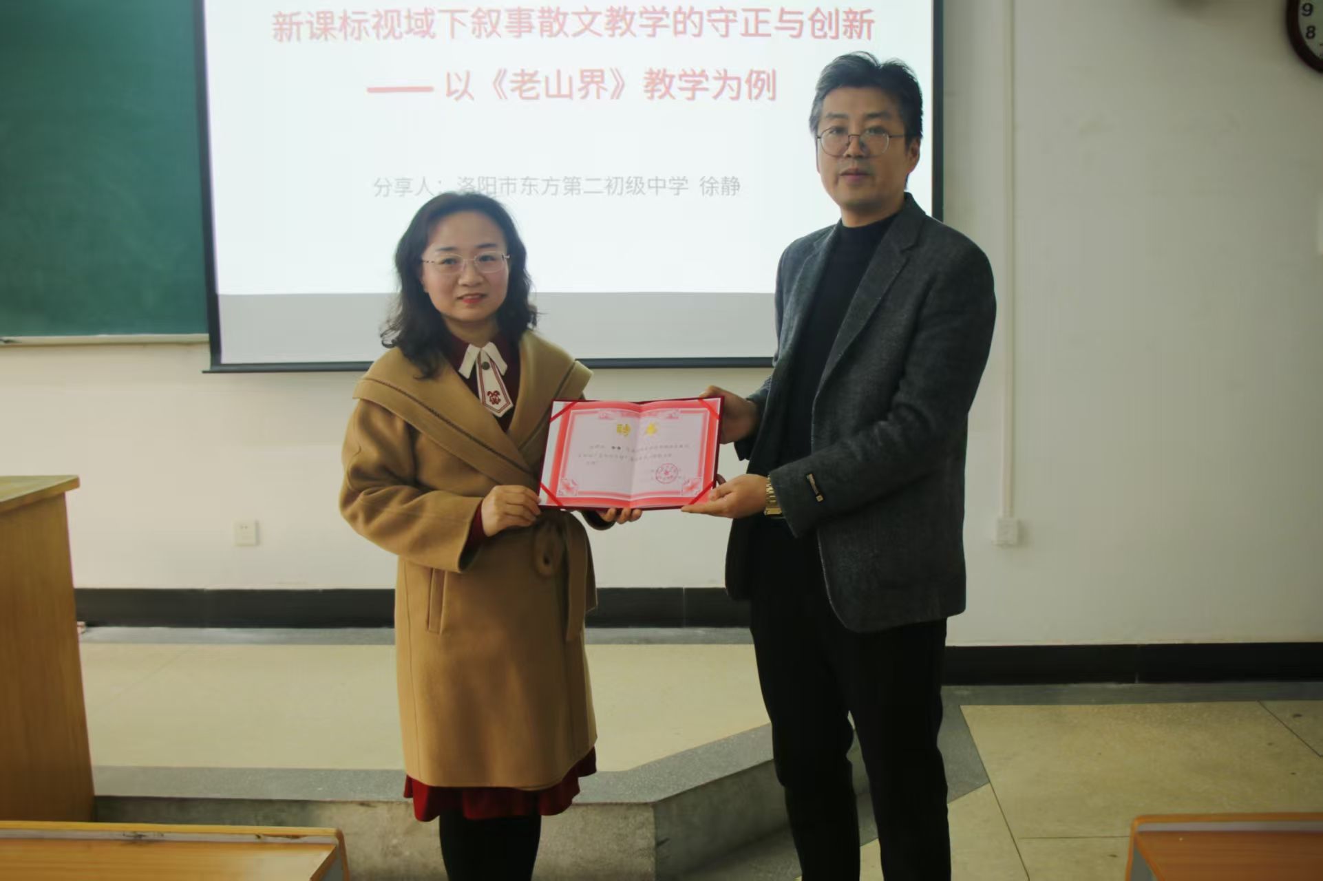 徐静老师以《老山界》为例,系统阐释了新课标背景下叙事散文教学的新发展,并提出叙事散文教学的三个方法:一是守正固本,运用“目标分层落实法”和“情境浸润法”,锚定教学核心根基,理解文本核心内涵与思想情感;二是创新赋能,通过“问题链驱动探究法”“对比辨析法”等策略,实现方法和评价机制创新;三是知行合一,强调以“叙事为基、抒情为魂”守住教学方向,以“情境鲜活、探究深度”激发课堂活力,做到“守正与创新”“工具性与人文性”“教师主导与学生主体”三个方面的辩证统一。徐静进一步鼓励同学们采用“过程性+实践性”的多元评价模式,推动叙事散文教学守正创新。讲座尾声,文学院副院长于涌为徐静老师颁发“洛阳师范卓越语文教师实验班‘名师工作坊’指导教师”聘书。