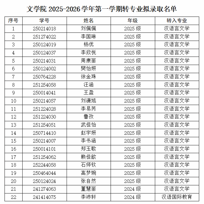 根据《洛阳师范学院普通本科生转专业暂行办法(修订)》(洛师政发〔2023〕41号)、《关于做好2025年本科学生转专业工作的通知》(校教〔2025〕40号)和《文学院2025年本科学生转专业工作方案》,经过学生本人申请,所在学院审核同意转出,文学院转专业工作小组通过考核遴选,录取刘佩佩等20名学生转入2025级汉语言文学专业、录取董慧丽转入2024级汉语言文学专业、录取李沛轩转入2024级汉语国际教育专业,现予以公示。公示日期为2026年1月14日-2026年1月16日,公示期为3个工作日。