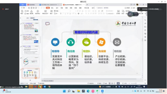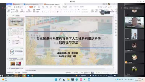 2022年12月15日下午3:00-5:30,中国传媒大学科学研究处处长周建新教授应文学院邀请,于腾讯会议开展了题为《自主知识体系建构背景下人文社科有组织科研的路径与方法》的报告,本次报告由文学院李亚副院长主持,文学院30余位青年教师参与讨论与学习。