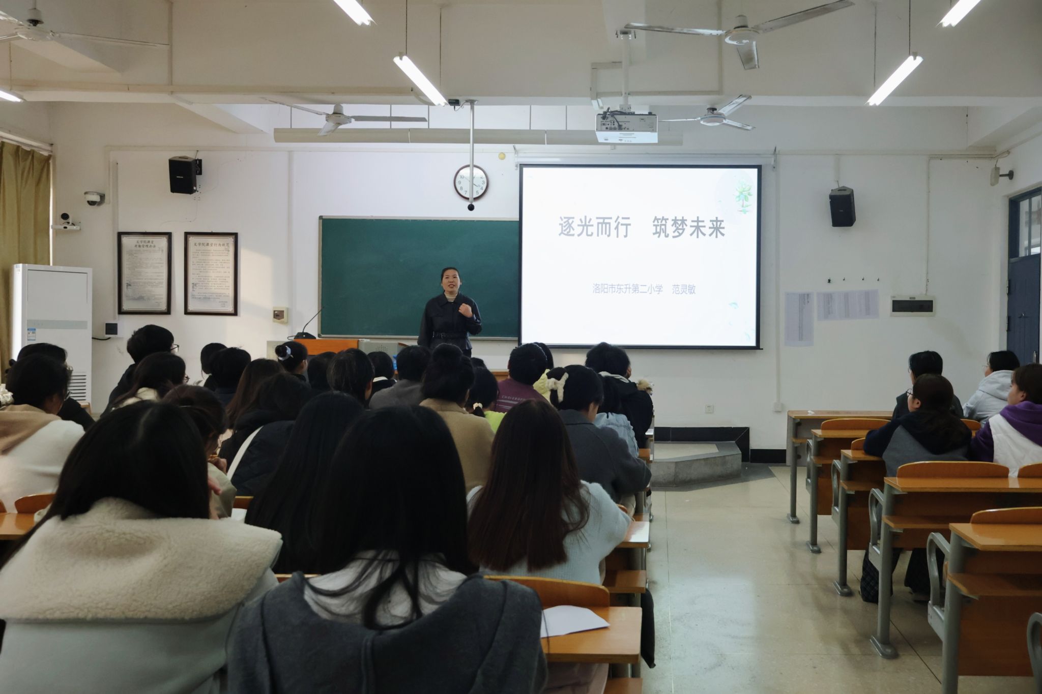 11月14日下午,文学院于A8-301举办“名师进课堂”系列讲座(第九期)。本次讲座主题为“新手教师的专业成长之路”,由河南省中小学高级教师,河南省骨干教师范灵敏主讲,文学院副院长于涌主持,文学院学生到场聆听。