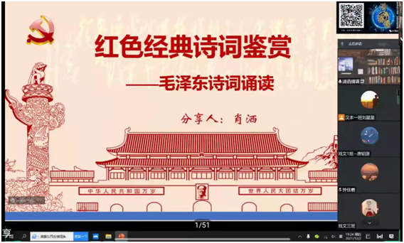 在宣讲会上,肖洒老师结合长期的理论研究和工作实践,作了题为《红色经典中的诗歌》专题讲座,内容涵盖了毛泽东同志的生平介绍、毛泽东经典诗词鉴赏诵读等等,不仅使同学们增进了对毛泽东同志的了解,也为大家阅读红色经典,传承中华文明提供了新的思路和方法。在宣讲中,肖洒老师亲切地邀请同学们进行线上互动,朗读红色诗词,并对学生的普通话技巧和情感表现进行指导。现场气氛活跃,学生积极参与。最后,肖洒老师高度肯定了同学们的表现,并表示希望以后有机会可以面对面再交流。