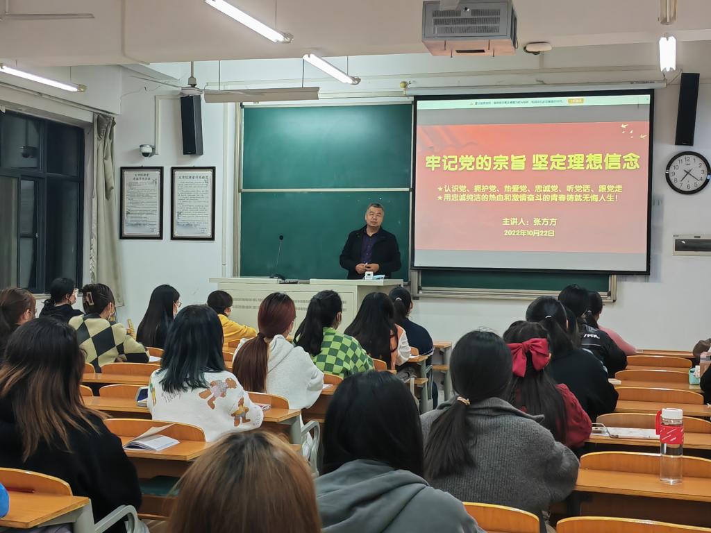 10月22日晚,文学院党委书记张方方于A8-314主持了以“牢记党的宗旨,坚定理想信念”为主题的党课培训,2022年下半年入党积极分子参与学习。