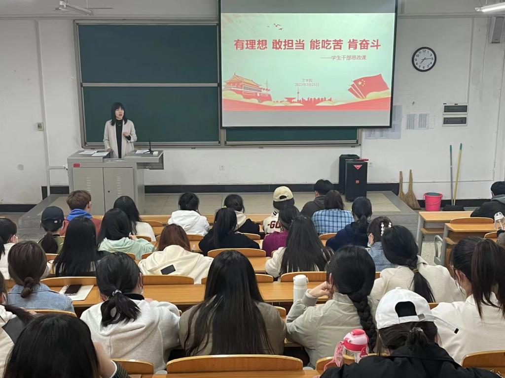 为深入学习宣传贯彻党的二十大和全国两会精神,引导“广大青年要坚定不移听党话、跟党走,怀抱梦想又脚踏实地,敢想敢为又善作善成,立志做有理想、敢担当、能吃苦、肯奋斗的新时代好青年,让青春在全面建设社会主义现代化国家的火热实践中绽放绚丽之花。”3月25日晚上,文学院党委副书记张曼在A8-101为全院学生干部讲授思政课。