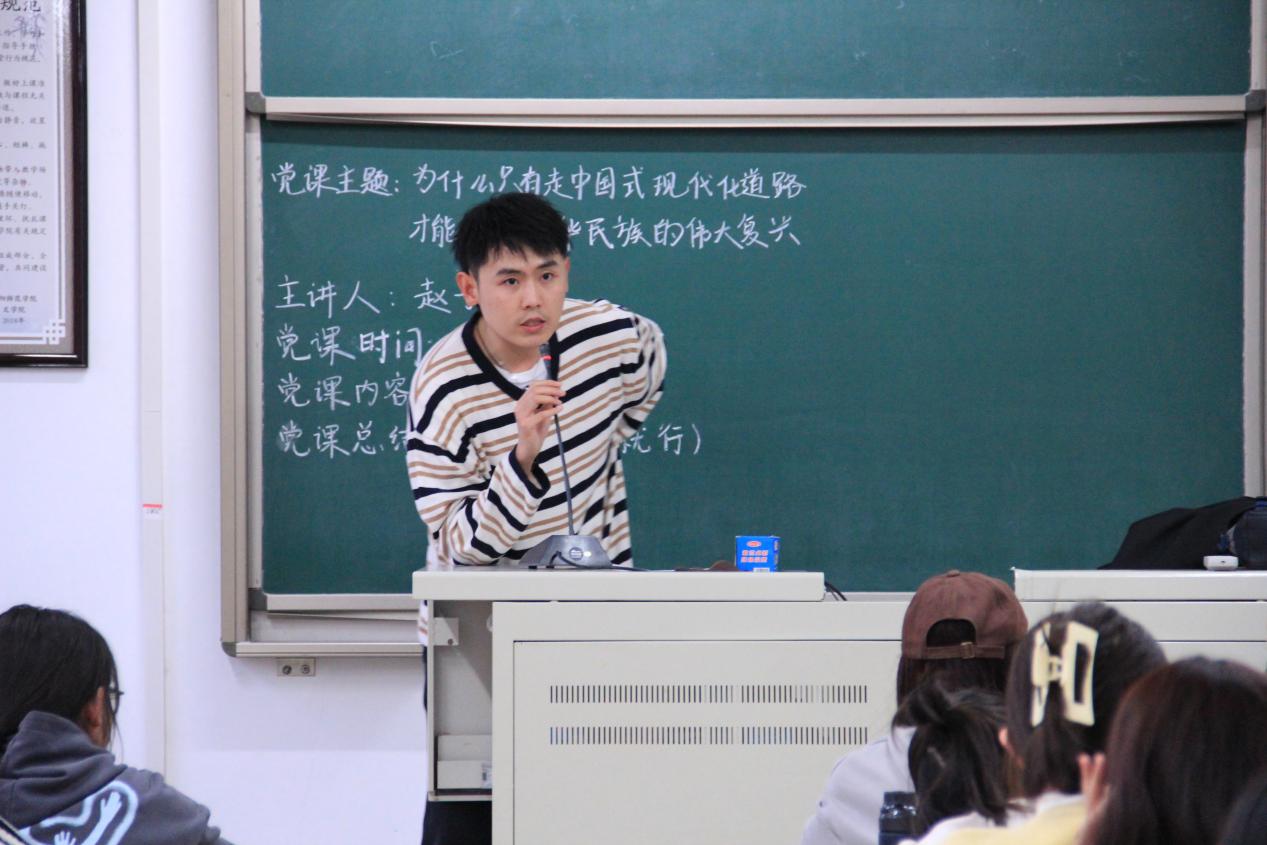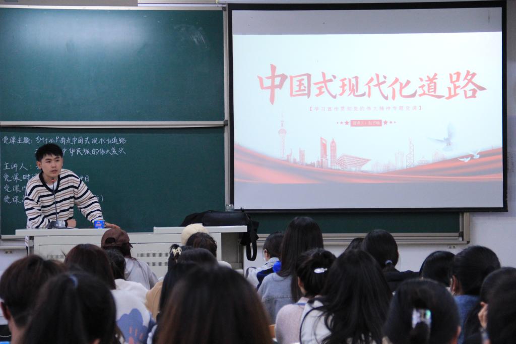 此次党课由赵子晗老师讲授,以“为什么只有走中国式现代化道路才能实现中华民族的伟大复兴”为主题,从我国独特的文化传统、独特的历史命运和独特的国情三方面出发,运用古今实例,向同学们生动地解读了中国式现代化道路的科学内涵。他强调,身为新时代大学生不仅要在校园里学好知识本领,还要利用假期走出去多看一看,领略祖国大好河山,增强自身的身份认同感和自豪感。
