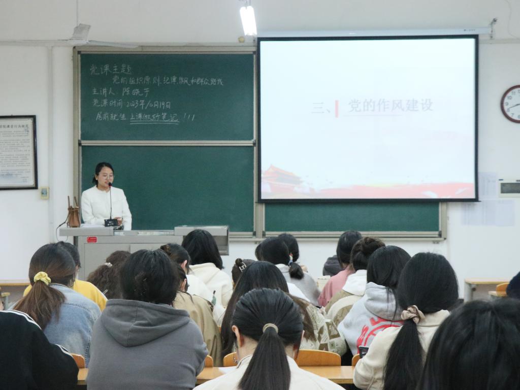 10月19日下午,文学院于A8—314开展以“党的组织原则、纪律、作风和群众路线”为主题的党课培训,辅导员陈晓于主讲,2023年下半年全体入党积极分子参加。