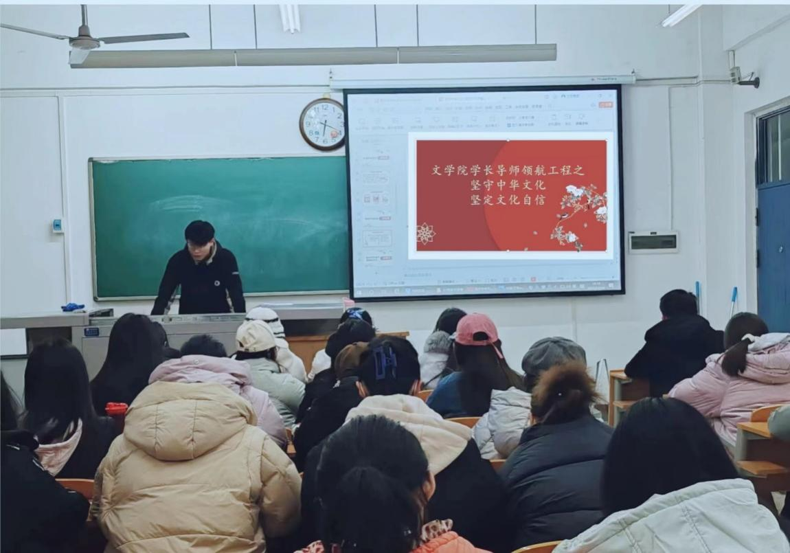 为全面提升学生专业文化素养,12月24日晚,文学院组织开展学长导师“领航工程”,本次活动以“坚定文化自信,弘扬传统文化”为主题,第五届学长导师团13名学长导师对2023级全体学生开展宣讲。