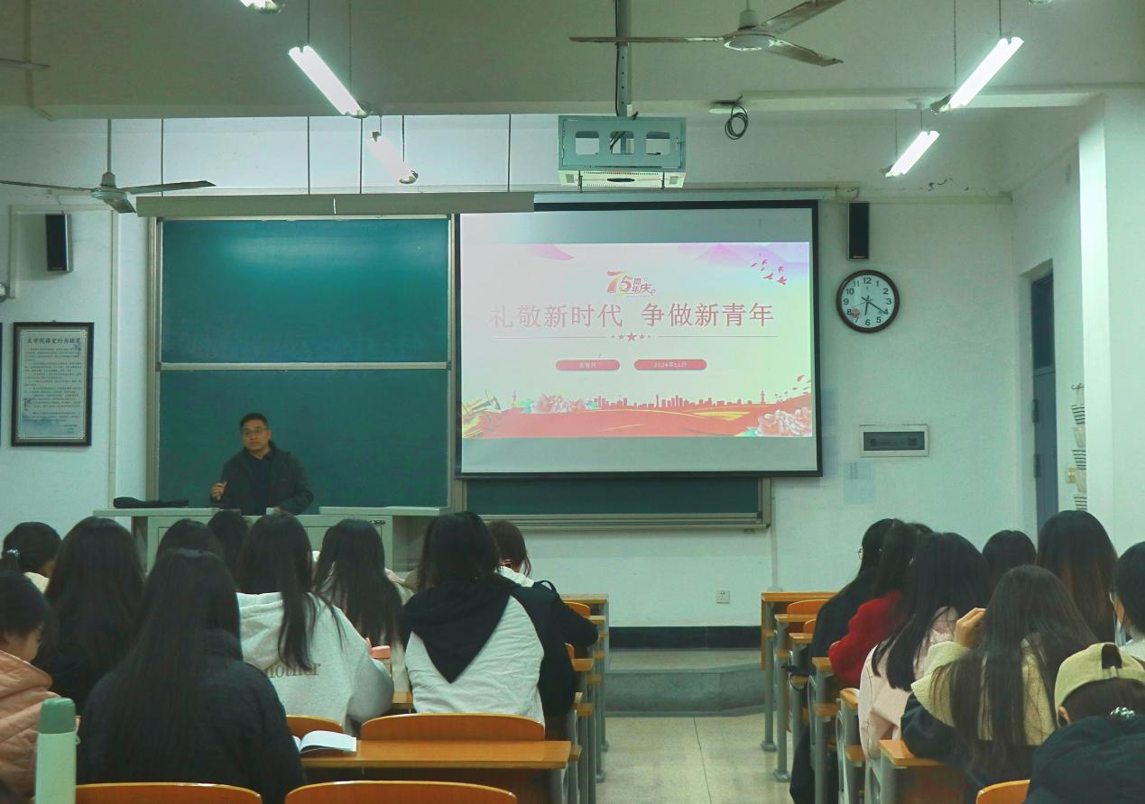 课程伊始,高春民以习近平总书记对青年的寄语—“青年人是祖国的未来,民族的希望,也是党的未来和希望”引出了争做新青年的主题,并突出强调了党中央对青年培养的重视。接着,他带领同学们回顾了新中国成立75年来的光辉历程,领略了在党的带领下我们所创造的伟大奇迹。他指出,新中国发展的伟大成就归根结底是青年有所作为,因此,作为新时代青年人更应当坚定理想信念,强化责任担当,砥砺奋斗精神,为实现中华民族伟大复兴贡献青春力量。