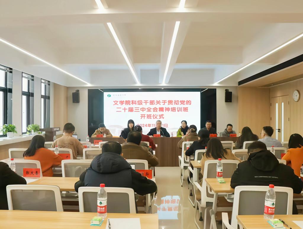11月21日下午,文学院在龙门书院二号院崇学讲堂开展科级干部关于贯彻党的二十届三中全会精神培训班开班仪式。学院班子成员及院科级干部参加,开班仪式由党委副书记张曼主持。