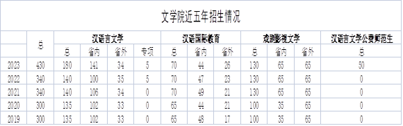 文学院共招生430人。其中,汉语言文学专业180人,省内招生141人,省外招生34人,地方专项5人;汉语言文学公费师范生50人;汉语国际教育专业70人,省内招生44人,省外招生26人;戏剧影视文学专业130人,省内招生65人,省外招生65人。