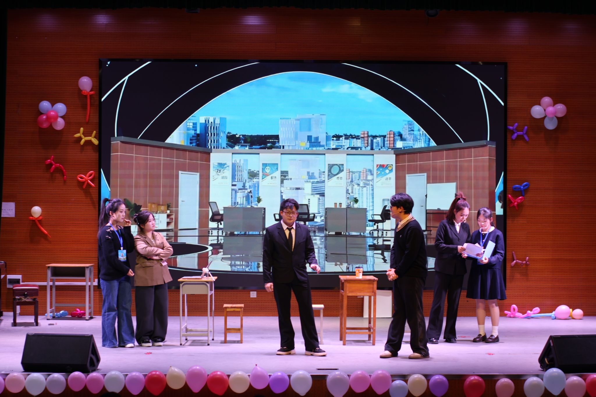 晚间开启的“幽默短剧夜”以热烈的开场舞点燃氛围,随后按“青春记忆·校园时光”“职场探索·人生百态”“情感共鸣·人生感悟”“梦想启航·正义之光”四大篇章层层推进。各篇章剧目或聚焦校园真实场景引发共鸣,或解构职场困境传递趣味思考,或融入创新元素展现创意活力,最终以温馨合唱收尾,将整场氛围推向高潮。整场演出贴近生活、充满青春活力,充分展现了学生的创作能力与对生活的细腻观察。