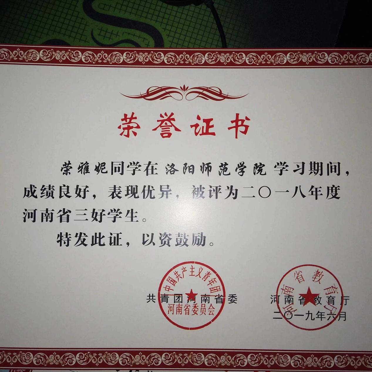 荣雅妮、女、中共党员、洛阳师范学院文学院2016级戏剧影视文学专业一班学生,现任职于北京爱奇艺科技有限公司文学事业部。在校期间,曾担任文学院学生会记者部部长、学生第一党支部组织委员。曾获“国家励志奖学金”、“河南省三好学生”等荣誉称号。