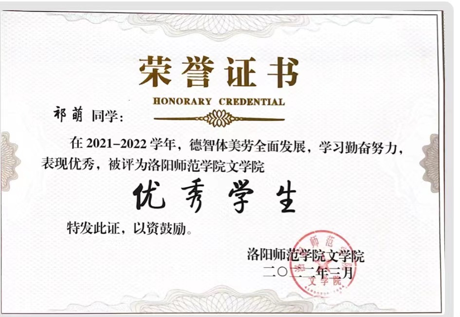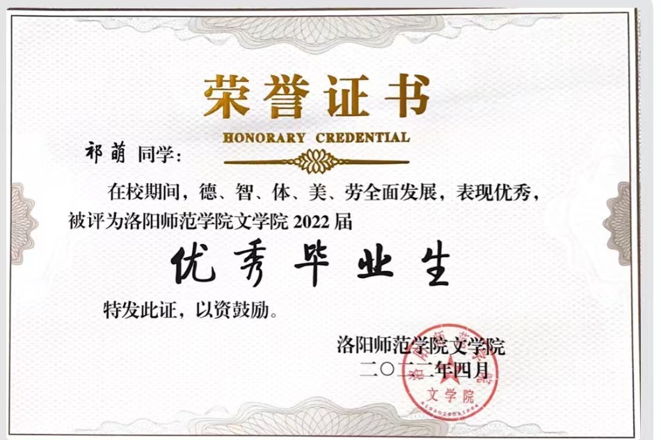 祁萌,女,洛阳师范学院文学院2018级戏剧影视文学专业的一名学生,现就职于新疆某镇人民政府。在校期间,曾获得洛阳师范学院“优秀学生”的荣誉,并被评为“优秀毕业生”。