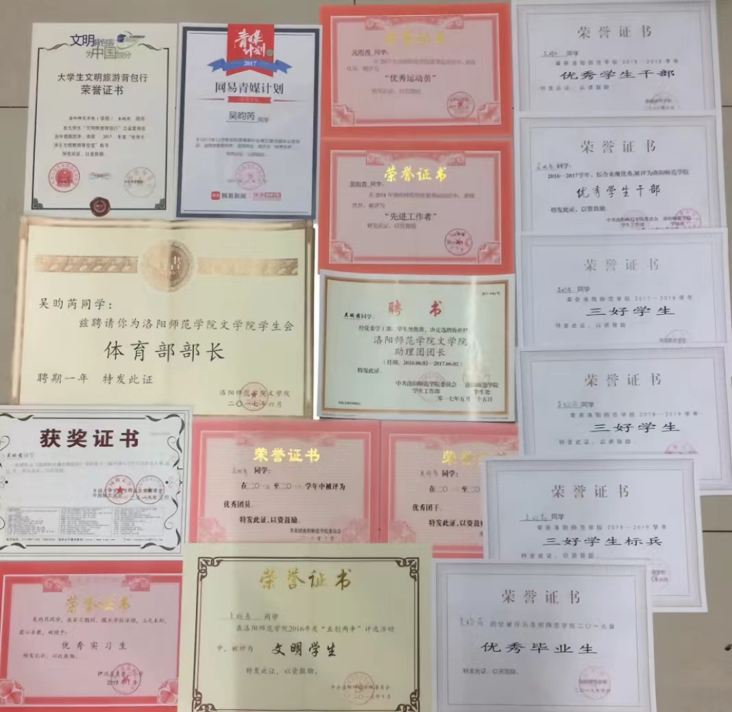 吴昀芮,女,毕业于洛阳师范学院汉语言文学专业,在校期间获得“文明学生”“三好学生”“优秀学生干部”“优秀毕业生”等多项荣誉,现工作于开封市鼓楼区检察院。