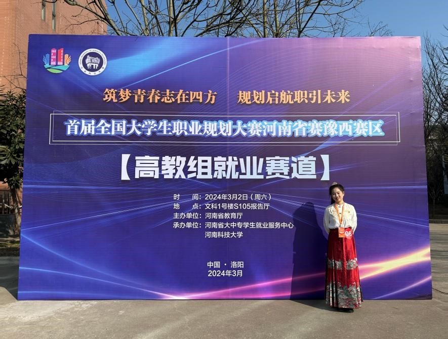 长期以来,我院高度重视学生的职业规划教育,从入学开始就开设职业生涯规划课程,帮助学生进一步明晰职业生涯规划,树立正确的职业价值观。同时,我院积极引导学生参与相关比赛,贯彻落实职业规划,在相关老师指导下攸雅暄荣获全省大学生职业规划大赛豫西赛区高教组就业赛道铜奖,在追梦路上实现青春梦想。