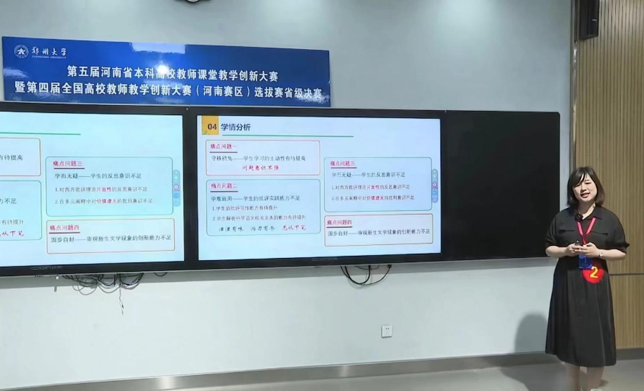 近日,河南省本科高校教师课堂教学创新大赛暨第四届全国高校教师教学创新大赛(河南赛区)选拔赛落下帷幕。经校级初赛、省级复赛、省级决赛等环节审定,我院教师刘知萌荣获新文科组特等奖。