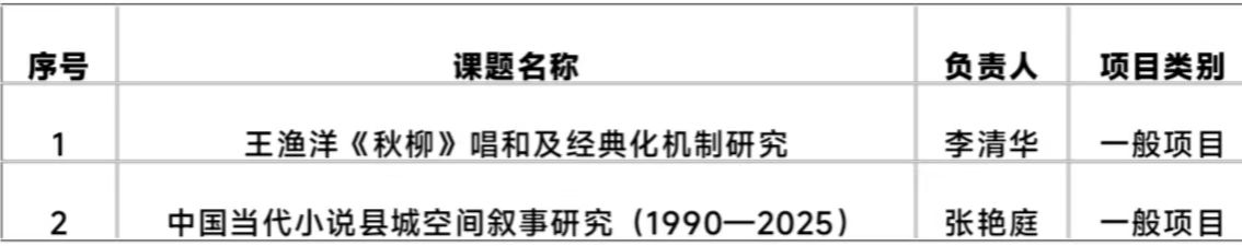 9月8日,全国哲学社会科学工作办公室公布2025年度国家社会科学基金项目立项结果,文学院教师李清华主持的《王渔洋〈秋柳〉唱和及经典化机制研究》与张艳庭主持的《中国当代小说县城空间叙事研究(1990—2025)》双双获批立项!