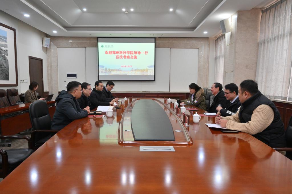 1月2日,郑州科技学院董事会办公室主任张智沫一行四人来我校考察交流。座谈交流会在成均楼B302会议室举行,党委副书记张运礼出席,党政办公室、党委宣传部、基建处等部门负责人参加会议。