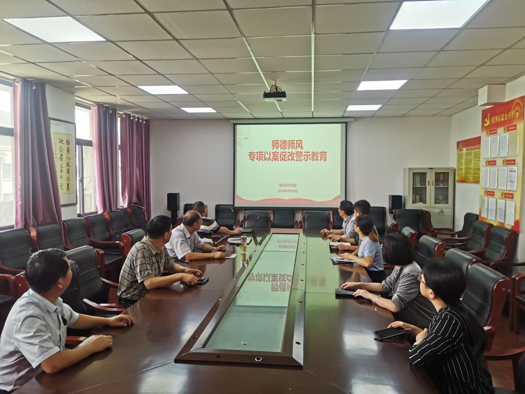 为进一步加强“以案促改”专项工作实效,强化师德师风建设,进一步增强教职工的纪律意识和遵规守纪的思想观念,按照《洛阳师范学院集中开展以案促改工作方案》的通知要求和学院的工作部署,9月24日下午,继续教育学院组织全体教职工在学院会议室开展了师德师风专项以案促改警示教育专题会议。会议有党总支副书记周富亭主持。