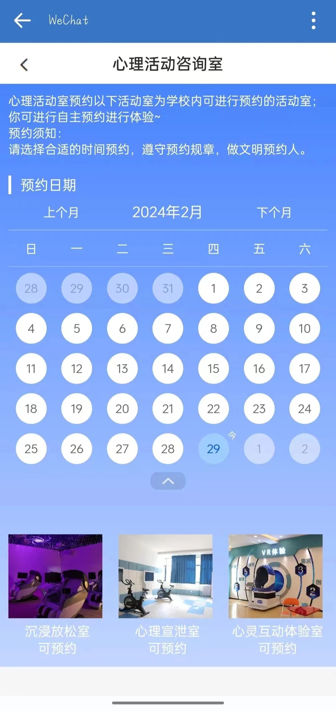 目前中心有心灵互动室、沉浸放松室、情绪宣泄室三种功能室可供同学们预约。