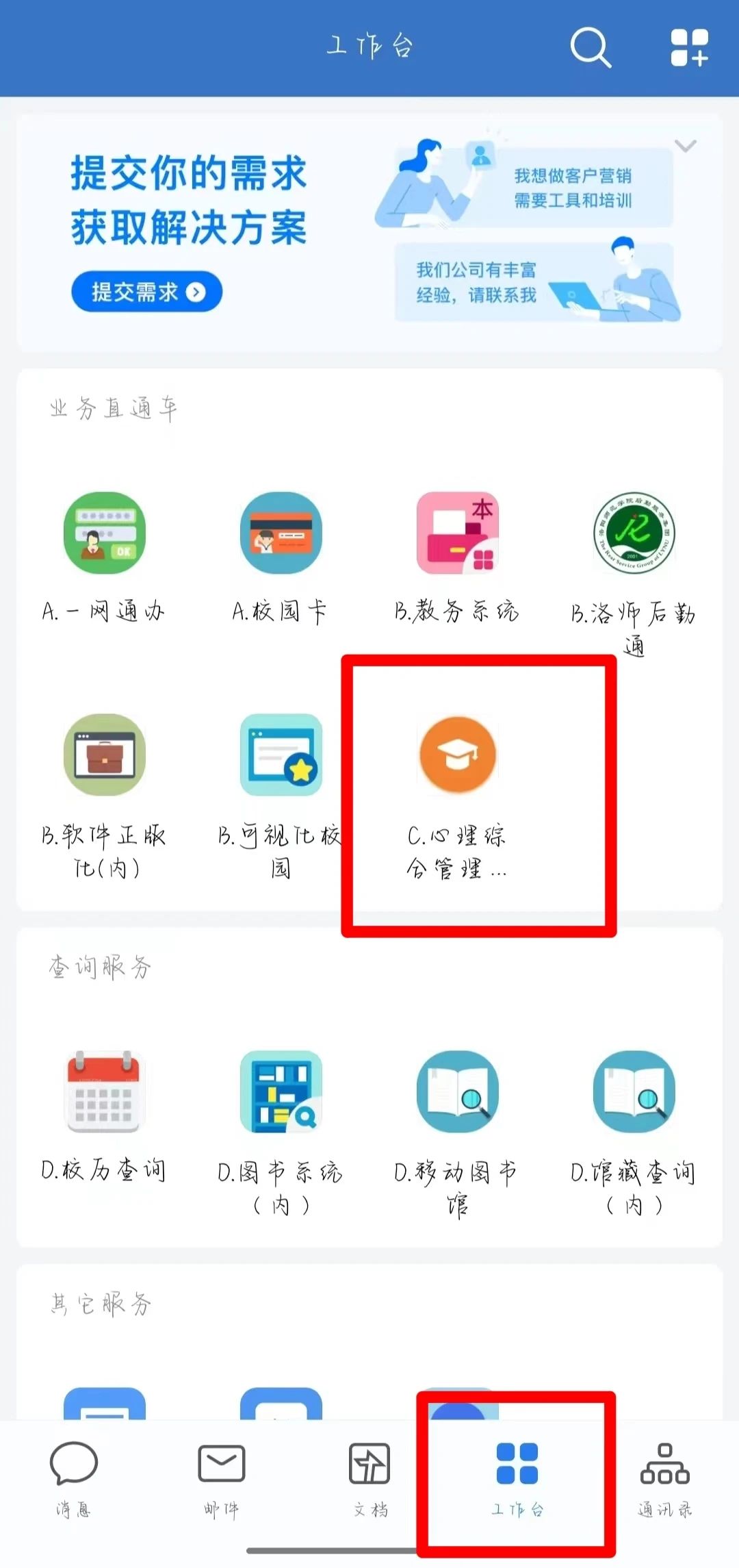 登录企业微信,进入“工作台”页面,点击“心理综合管理系统”