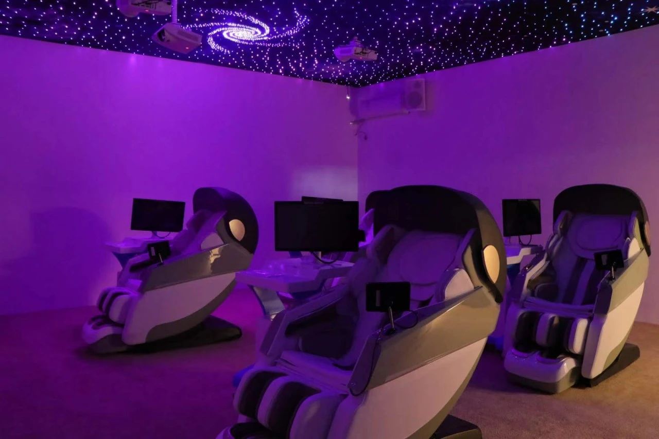 这里有按摩椅、星空顶、投影仪、身心检测仪等设备,通过构造一个特殊的空间,旨在提供一个放松、恢复和舒缓身心压力的环境;在这个室内环境中,我们可以经历一种沉浸式的体验,通过各种感官刺激来舒缓紧张情绪、减轻焦虑和压力。大家应该刷到过各类“沉浸式”的视频,顾名思义,沉浸放松室就是让大家沉浸式体验,舒适的座椅、温和的布局,为我们提供一个放松环境,以帮助我们远离繁忙的生活和压力,进入一个安静、平和的状态。