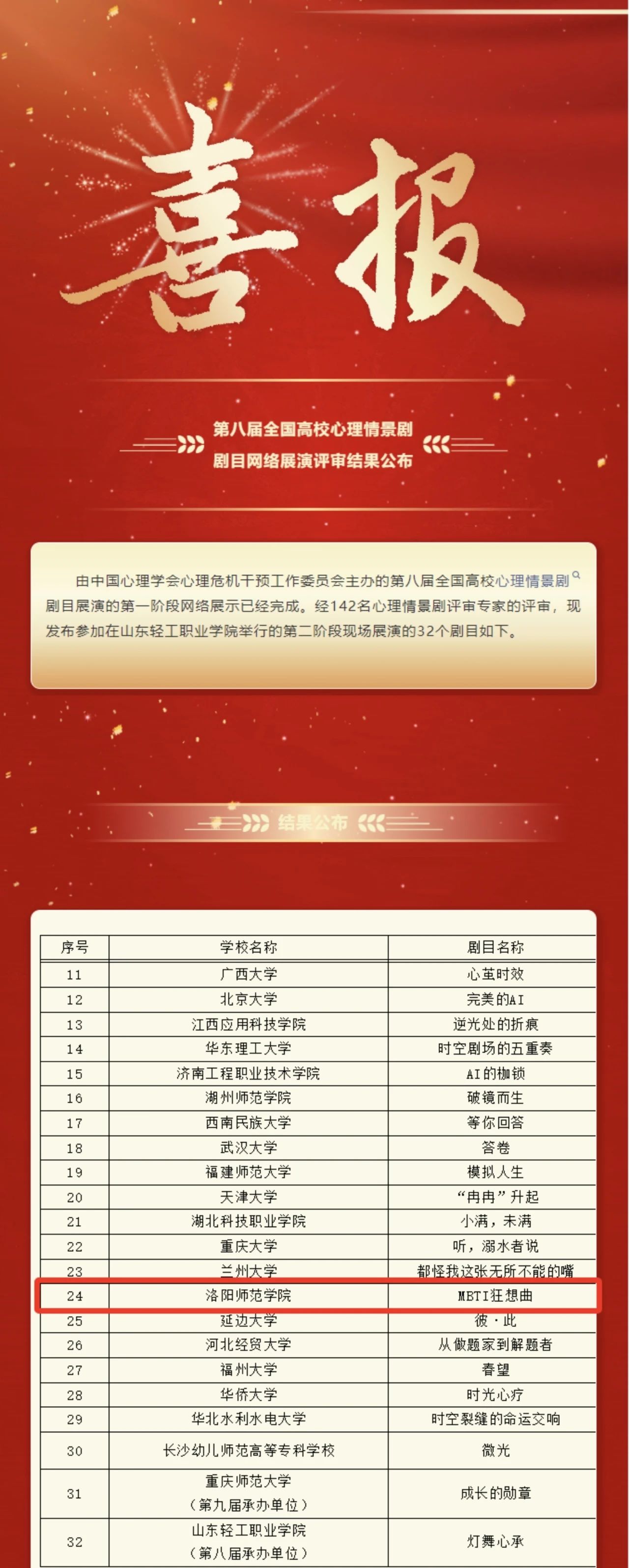 近日,我校心理情景剧作品《MBTI 狂想曲》在全国高校心理情景剧大赛收到的375部作品中脱颖而出,成功入选第八届全国高校心理情景剧大赛现场展演,并荣获 “展演剧目” 荣誉!