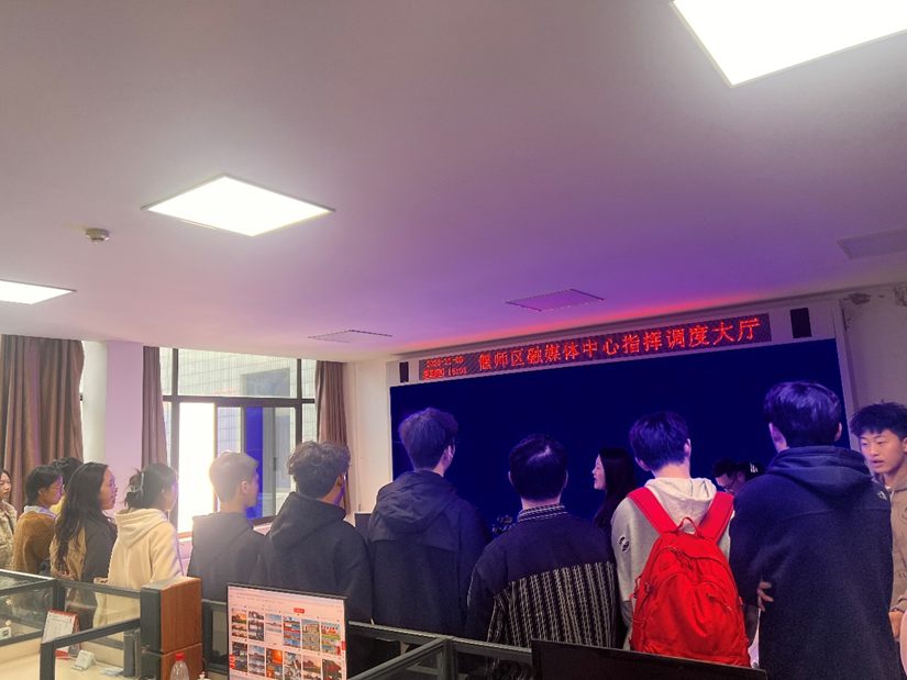 同学们跟随实习基地老师共同了解基地的发展历程,以及融媒体中心日常的工作环境和工作内容,先后参观了演播厅,调度大厅,舆情检测中心和直播间。同学们通过观看融媒体新闻中心制作的视频新闻、文旅宣传片等优秀作品,结合相关课程中所学的专业知识,进一步了解到作为媒体人一专多能的职业素养要求。