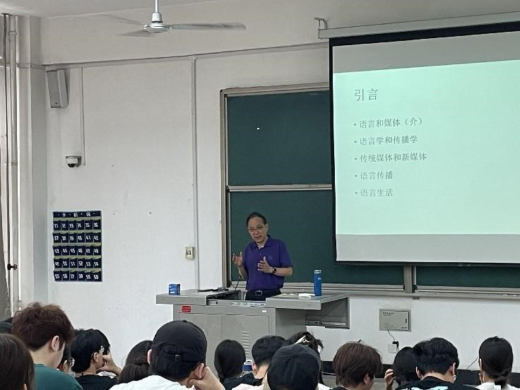 郭熙教授从“语言和媒体”、“语言学和传播学”、“传统媒体和新媒体”、“语言传播”和“语言生活”五个方面展开讲学。他强调,语言作为传播对象和新闻传播媒介,在不同历史时期需要不同的传播介质。他结合详实的案例,阐述了社会语言生活对媒体语言的要求,并提出新闻语言的规范与创新。