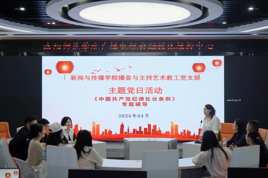 为深入学习贯彻修订后的《中国共产党纪律处分条例》,推进党风廉政教育,4月25日下午,播音与主持艺术教工党支部在A9-110召开《中国共产党纪律处分条例》专题辅导党日活动。活动由党支部书记李姗姗主持。