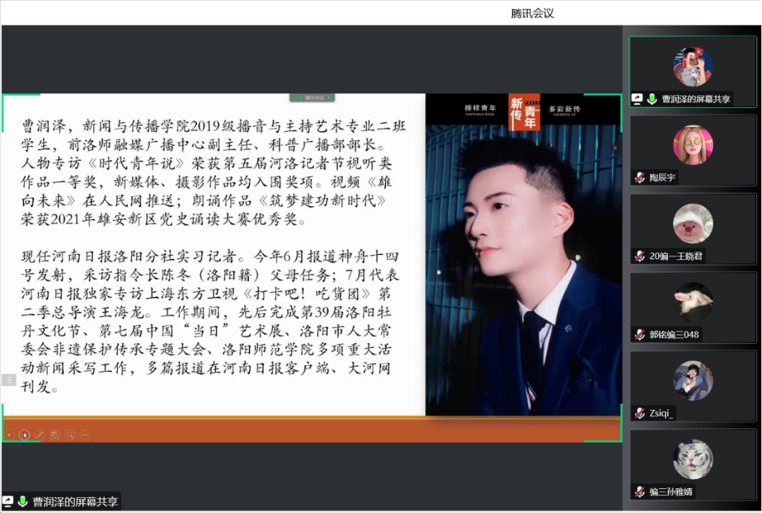 为进一步提高学院学生就业竞争力,帮助同学们进一步了解媒体实践工作流程。11月3日下午,学院启梦大讲堂——“寻梦记者之旅”专题讲座于线上举办。新闻与传播学院2019级播音与主持艺术专业学生、优秀实习生代表曹润泽担任主讲人。