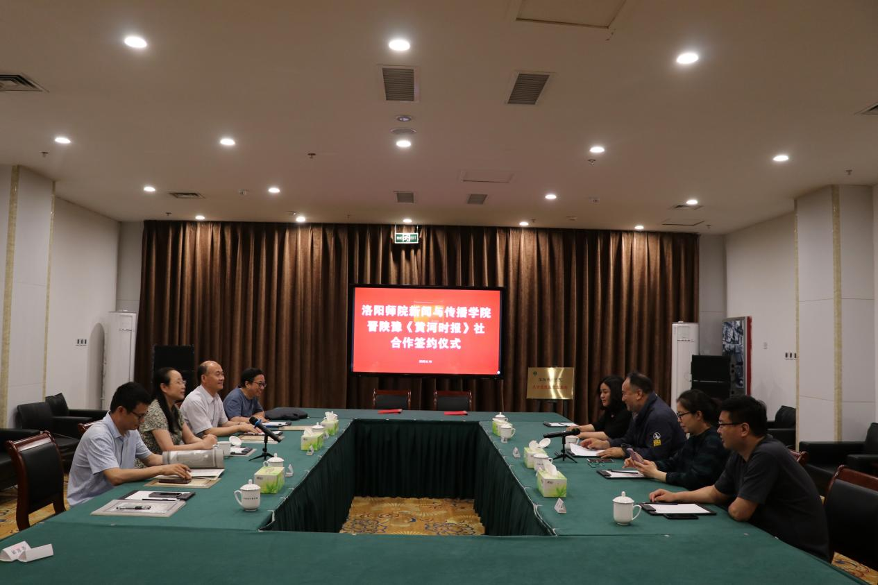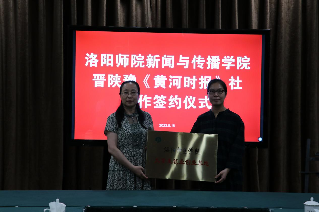 钱越、李正学一行参观走访了《黄河时报》编辑部和中国摄影艺术展。孙振军对钱越、李正学一行表示热烈欢迎,他详细介绍了《黄河时报》目前运营的相关情况,以及对青年人才的强烈渴求。李正学全面介绍了我院在专业设置、人才培养、实验室建设和品牌建设等方面的具体情况,并表达了深化校企合作,提升融媒人才培养质量的强烈愿望。最后,双方在共建实习实训基地和就业创业基地,黄河文化数字融合传播实验室建设和产学研深度融合等方面达成合作意向。院长李正学代表我院与《黄河时报》总编辑孙振军签署共建融媒实践基地合作协议,党委书记钱越代表我院向《黄河时报》授牌洛阳师范学院“大学生就业创业基地”。