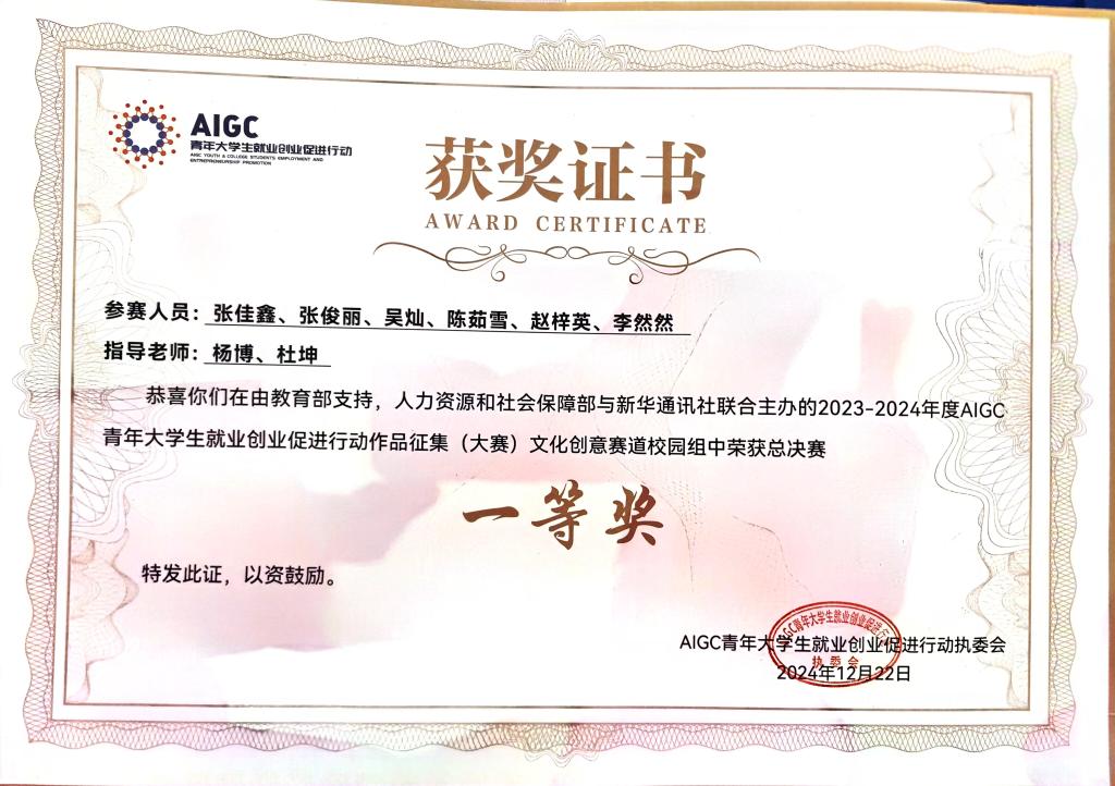 12月22日,由教育部支持,人力资源社会保障部与新华社联合主办的“AIGC青年大学生就业创业促进行动大赛”颁奖典礼在深圳南方科技大学落幕,我校新闻与传播学院影视创意工坊报送的作品《李上林传》斩获文化创意赛道一等奖,位列全国第一!