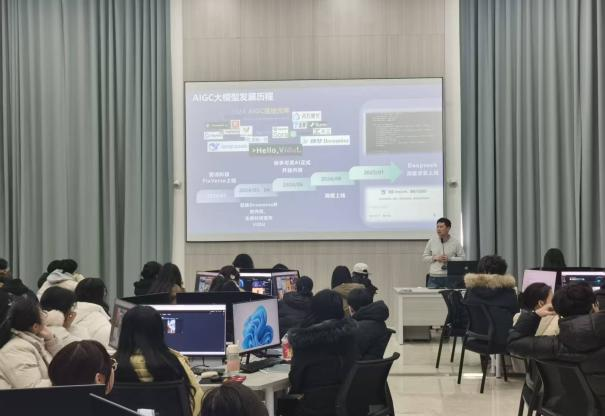 杜坤老师以丰富的案例和深入浅出的讲解,向在场师生介绍了AI影像创作的前沿技术与发展趋势。他详细讲解了AIGC技术的基础概念与应用案例,让大家对AI 技术在影像领域的强大功能有了具体的认识。下午,杨博老师结合自身实践经验,分享了AIGC微短剧的创作方法与技巧。通过现场示范,他带领学生实践了从创意构思到素材生产的核心流程,使同学们更清晰地了解到 AIGC技术在影像创作中的具体操作流程。