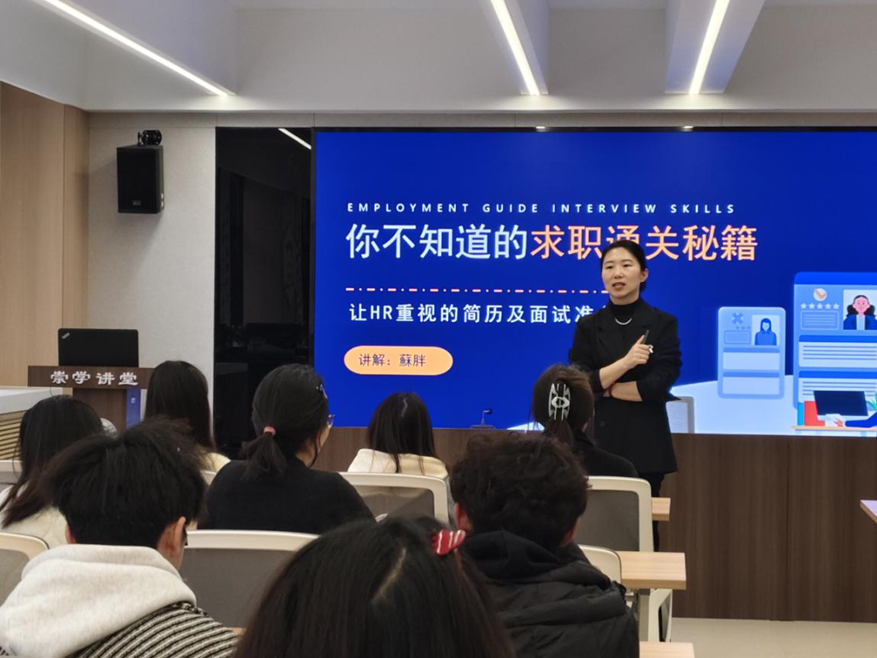 讲座现场,邵冬丽导师围绕“招聘平台初印象”、“简历制作技巧”和“面试前的准备”三个方面展开分享,为同学们详细讲解如何打造一份吸引HR眼球的简历,以及如何在面试中脱颖而出。她结合自身多年的招聘经验,深入剖析HR筛选简历的关键点,帮助同学们避开简历中的常见误区,并传授如何根据不同的岗位需求定制化简历内容。此外,邵导师还分享了面试中的实用技巧,包括如何展现个人优势、应对压力面试等,助力同学们在面试中自信发挥,赢得心仪的工作机会。最后,邵冬丽导师还特意留出时间与同学们互动,耐心解答了大家在简历制作和面试准备过程中遇到的困惑,并提供了针对性的建议。