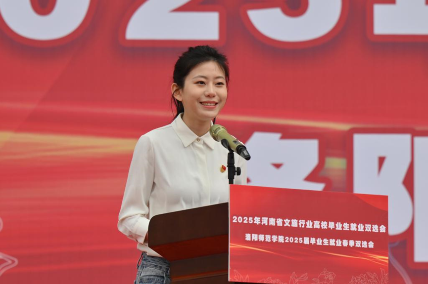 3月29日,由河南省教育厅、河南省文化和旅游厅主办,洛阳师范学院承办的“豫荐未来·青春启航”2025届毕业生春季双选会在太学广场举行。我院党委书记韩守东、院长李正学带队,院党委副书记金宜洛、就业负责老师及毕业班辅导员深入现场了解就业形势,我院2021级播音与主持艺术专业毕业生陈梓馨代表发言。