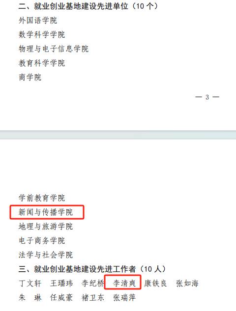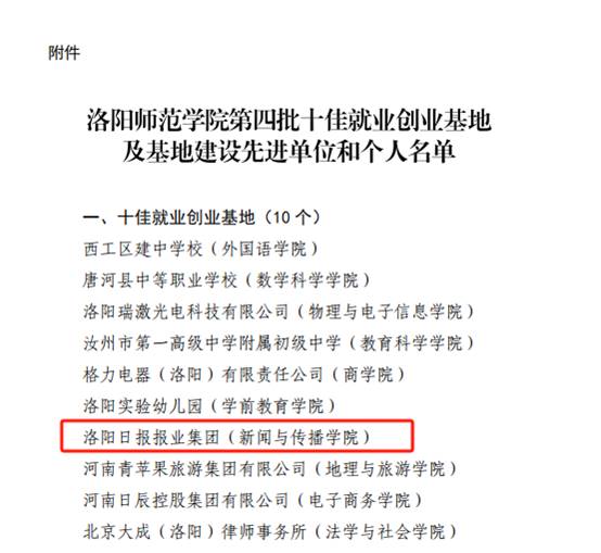 我院被授予“洛阳师范学院就业创业基地建设先进单位”荣誉称号;我院合作单位洛阳日报报业集团用人单位被授予“洛阳师范学院十佳就业创业基地”的称号;院就业办负责老师李清爽荣获“就业创业基地建设先进工作者”称号。