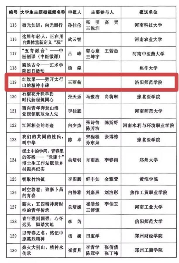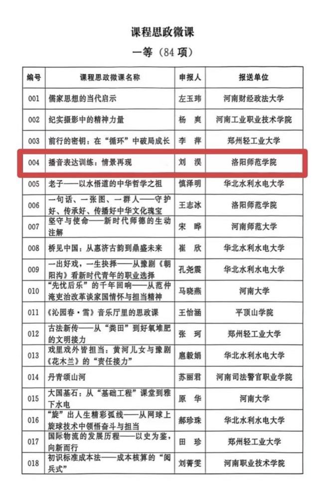 由我院播音与主持艺术系教师刘淏讲授,融媒体中心石莉莉、刘涛摄制的微课作品《播音表达训练:情景再现》在课程思政微课类别中荣获一等奖;由王子芃老师指导,刘畅、武子轩同学主创的作品《百年回响・薪火相传》在大学生主题微视频类别中荣获一等奖;由冯夏老师指导、王丽兹同学主创的作品《红旗渠——劈开太行山的精神丰碑》在大学生主题微视频类别中荣获二等奖;由徐思祺同学主创的作品《弘扬伟大抗战精神,赓续民族复兴为伟力》在大学生主题微视频类别中荣获二等奖。