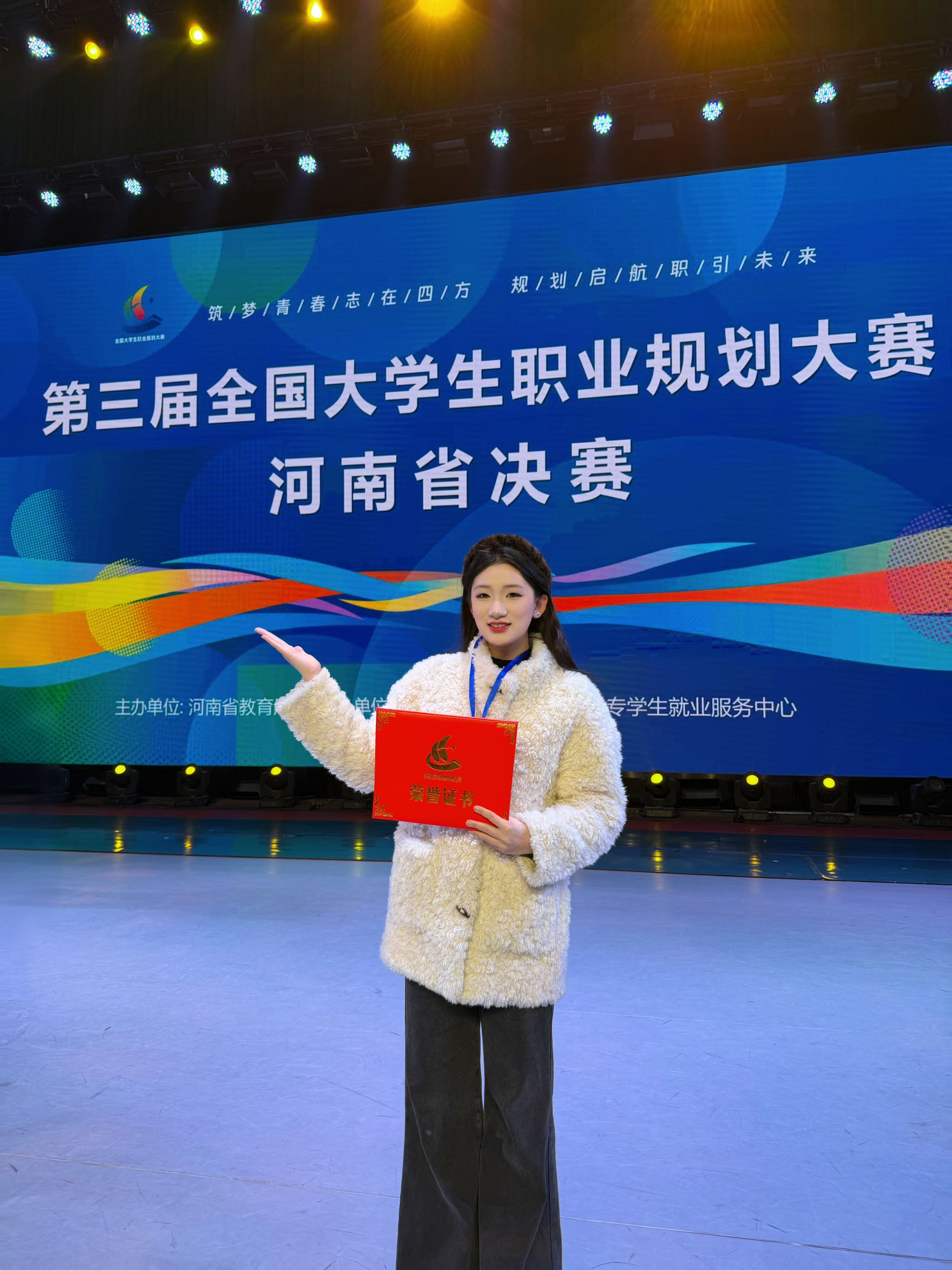 她反复研读新闻行业准则,拆解民生融媒体记者的能力要求,对着镜子一遍遍练习演讲,纠正语气、神态与节奏,即便疲惫到嗓子沙哑、思路卡顿,也从未想过放弃。她始终坚信,真正的职业规划从不是纸上谈兵,而是用实践支撑理想,用热爱抵御困难。决赛现场,她带着这份全力以赴的真诚,讲述自己的初心、成长与坚守,用最真实的故事、最清晰的路径、最扎实的能力、最坚定的信念、打动评委,最终成功斩获河南省职业规划大赛金奖。