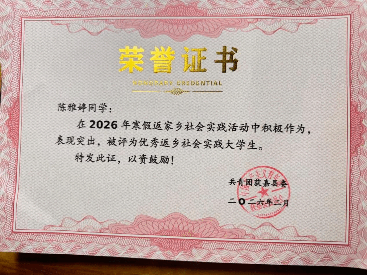 近期,在刚刚结束的寒假返乡社会实践中,我院2024级广播电视编导专业一班陈雅婷同学积极投身获嘉县行政宣传工作,主动配合当地各类活动开展,用青春行动展现青年担当,获优秀返乡社会实践大学生荣誉称号。
