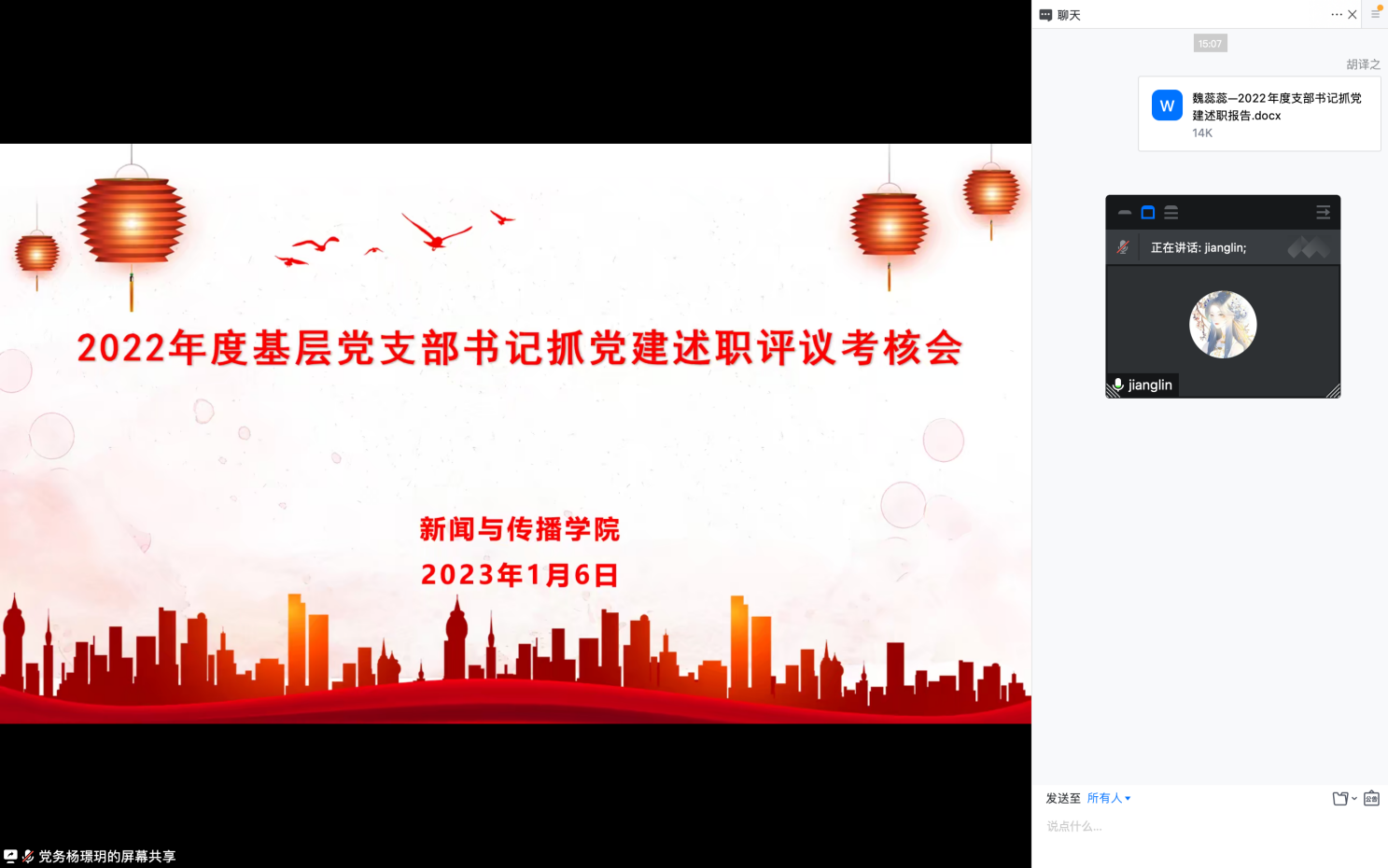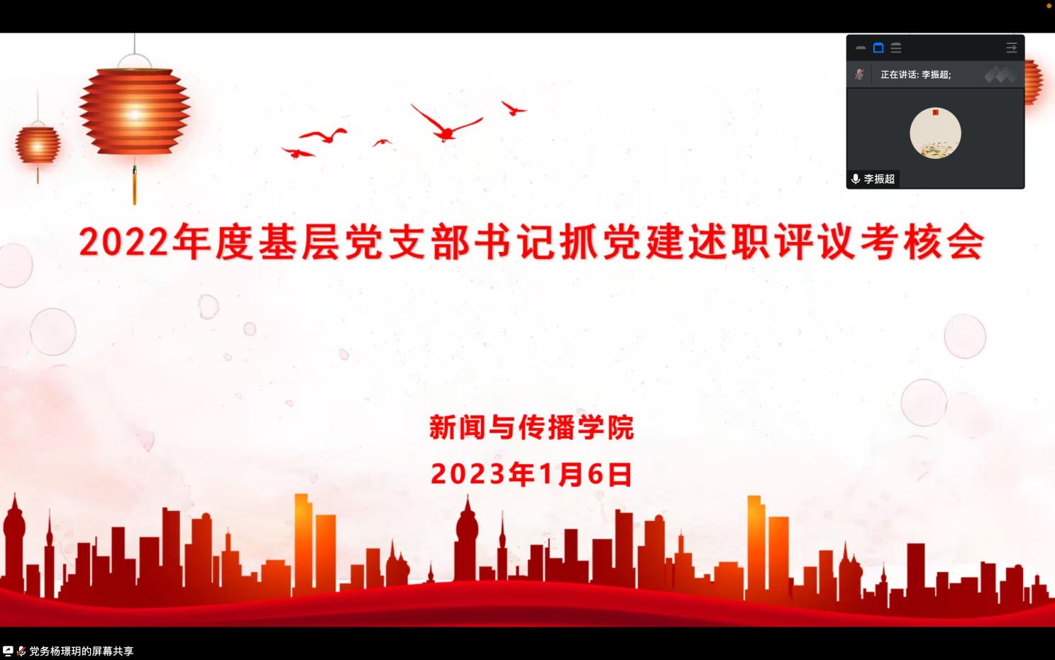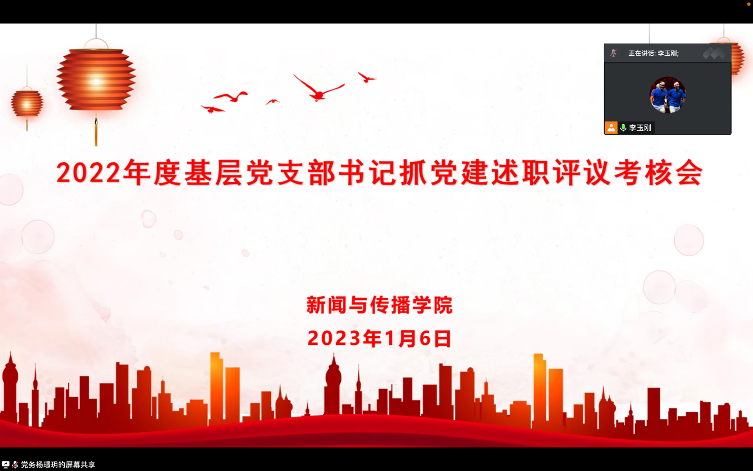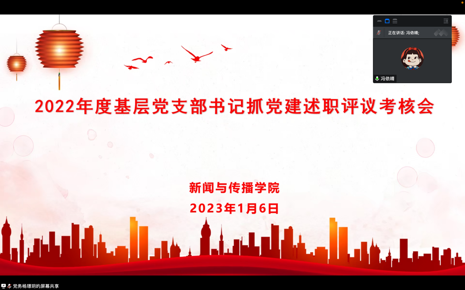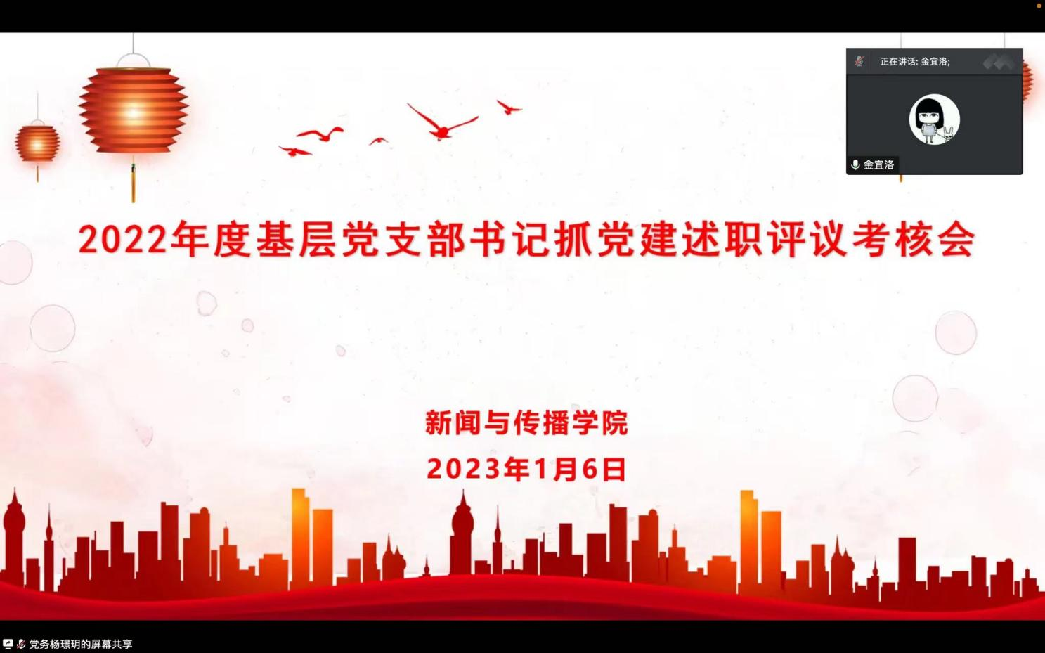 2023年1月6日,新闻与传播学院在线上召开2022年度基层党支部书记抓党建述职评议考核会,全体教职工及学生党员代表参加会议。会议由学院党委副书记金宜洛同志主持。