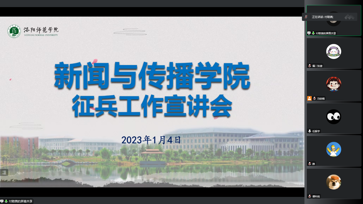 为积极做好2023年春季征兵工作,及时落实各项工作安排。1月3号下午,我院召开征兵工作推进会,会议由院党委副书记金宜洛主持,各年级辅导员参加会议。