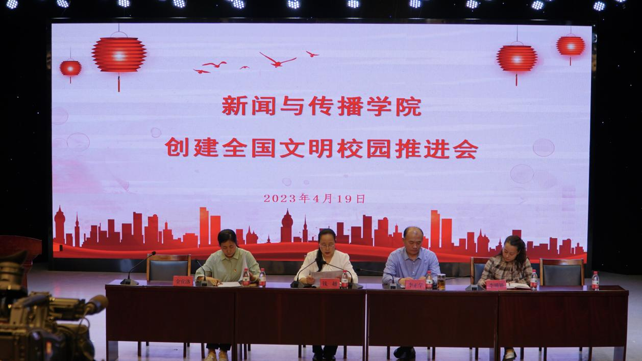 4月19日下午,我院在A9—106演播厅召开新闻与传播学院创建文明校园推进会,学院领导班子成员、全体教职工和学生党员代表参加会议,会议由学院党委副书记金宜洛主持。