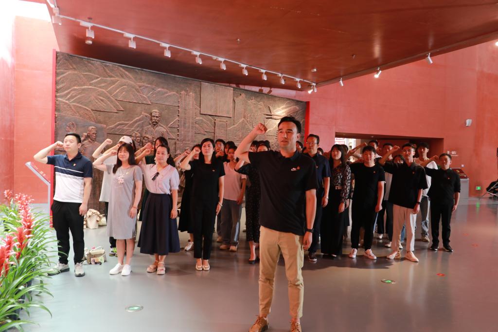 参观结束后,大家面对鲜艳的党旗,重温入党誓词。 “我志愿加入中国共产党,拥护党的纲领,遵守党的章程,履行党员义务……”十二句八十字,一字一句,表达出对党的赤诚忠心和为共产主义奋斗终身的坚定决心。