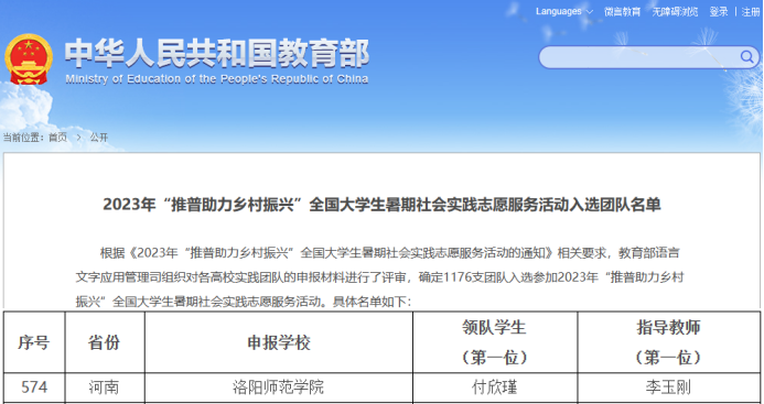6月27日,由教育部语言文字应用管理司和团中央青年发展部联合组织开展的2023年“推普助力乡村振兴”全国大中专学生暑期社会实践志愿服务活动入围团队名单公布。我院“益”起推普爱心实践队经过层层推荐、资料审核、专家评审等程序,成功入围2023年“推普助力乡村振兴”全国大中专学生暑期社会实践志愿服务活动。