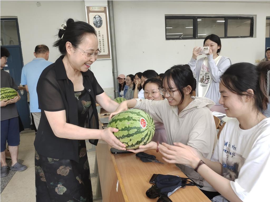 领导班子成员和辅导员为在场同学送上学院准备的西瓜、牛奶和饮料。在场同学纷纷表示会抓紧暑假留校的时间积极复习,要争取在今年的考研中取得满意的成绩,也感谢学院为考研同学提供的帮助和支持。